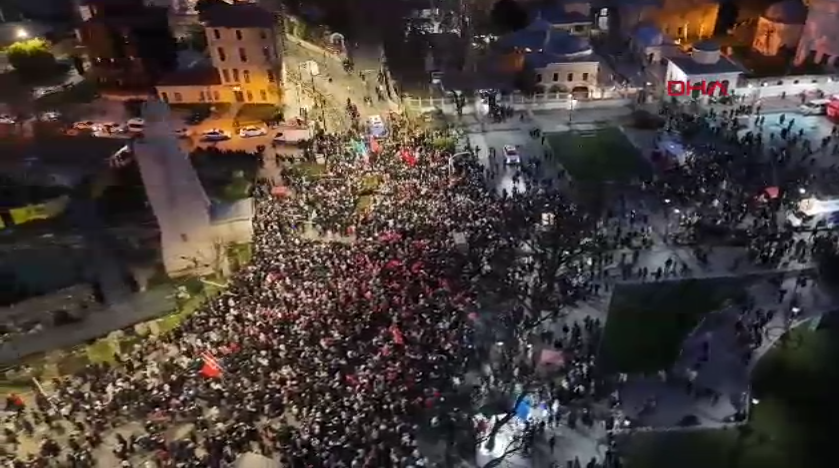Sultanahmet'te toplananlar ise Galata Köprüsü'ne doğru yürüyüşe geçti. Grubun yürüyüşü havadan görüntülendi.
