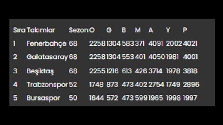 İki takım, geride kalan 2 bin 258 müsabakada bin 304'er galibiyet elde etti. Galibiyet sayısında açık ara önde olan iki takımı bin 216 galibiyetle Beşiktaş takip etti.