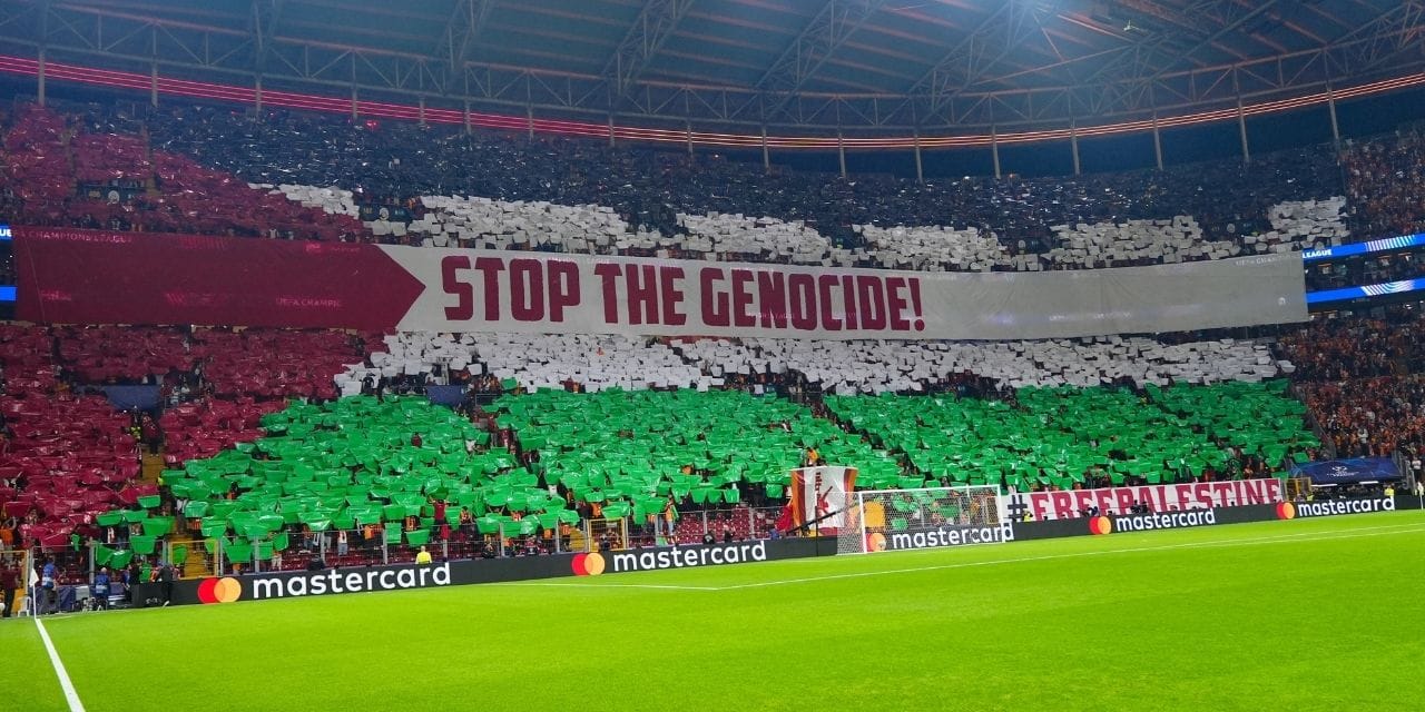 Sarı kırmızılı taraftarlar Gazze'deki insanlık dramına dikkat çektiler ve Filistin bayrağı açarak üstüne de İngilizce "Soykırımı durdurun" diye yazdılar.