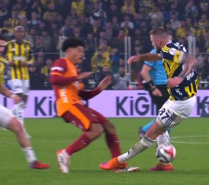Süper Lig'de oynanan Fenerbahçe-Galatasaray derbisinde sarı-kırmızılı taraftarlar, Milan Skriniar ve Gabriel Sara'nın içinde bulunduğu pozisyona isyan etti.