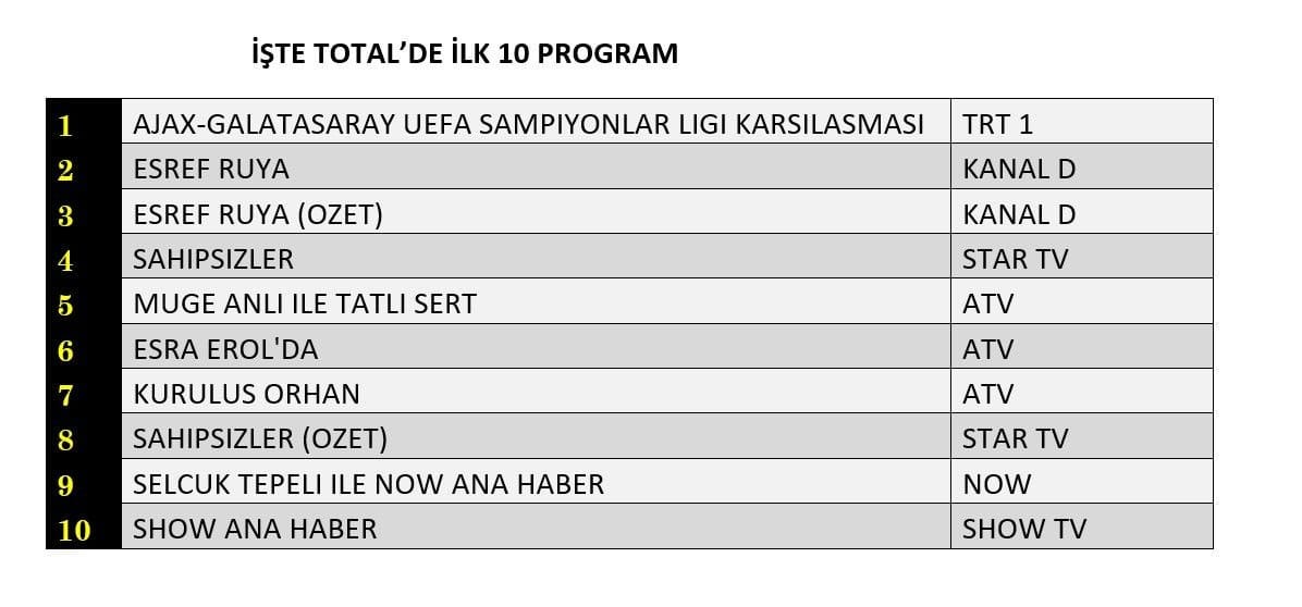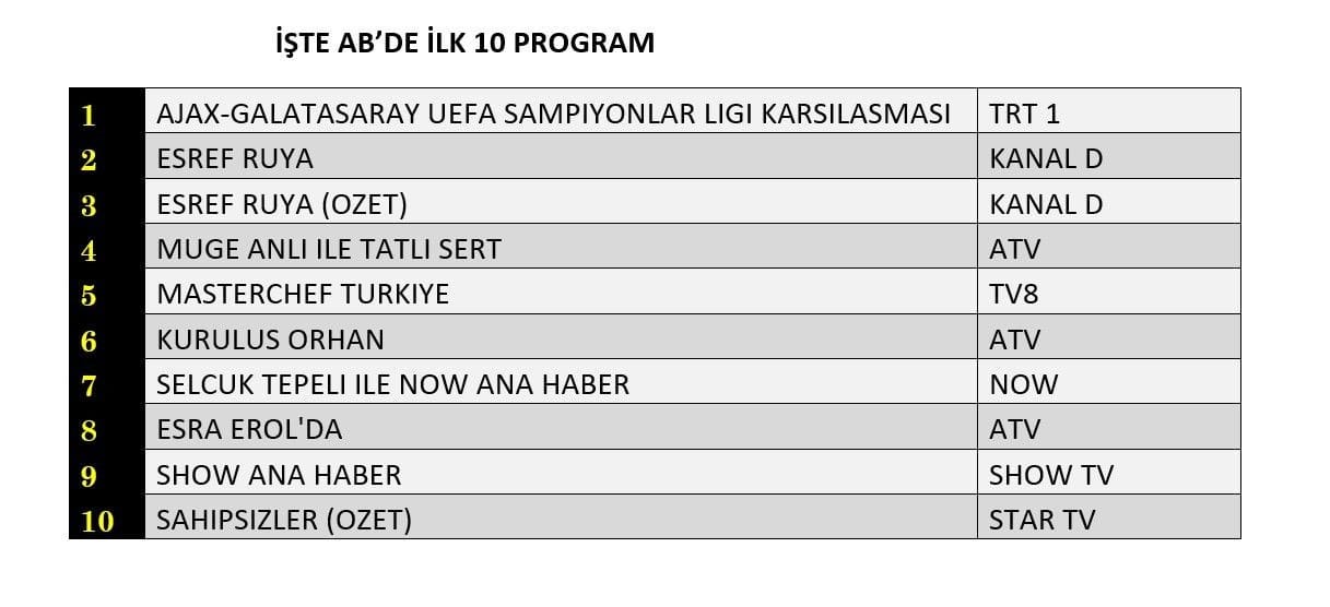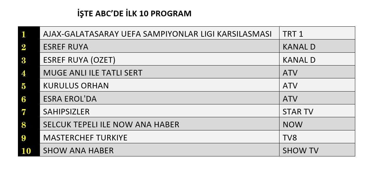 Ajax-Galatasaray maçı dün gece 3 farklı kategoride de en çok izlenen program oldu.