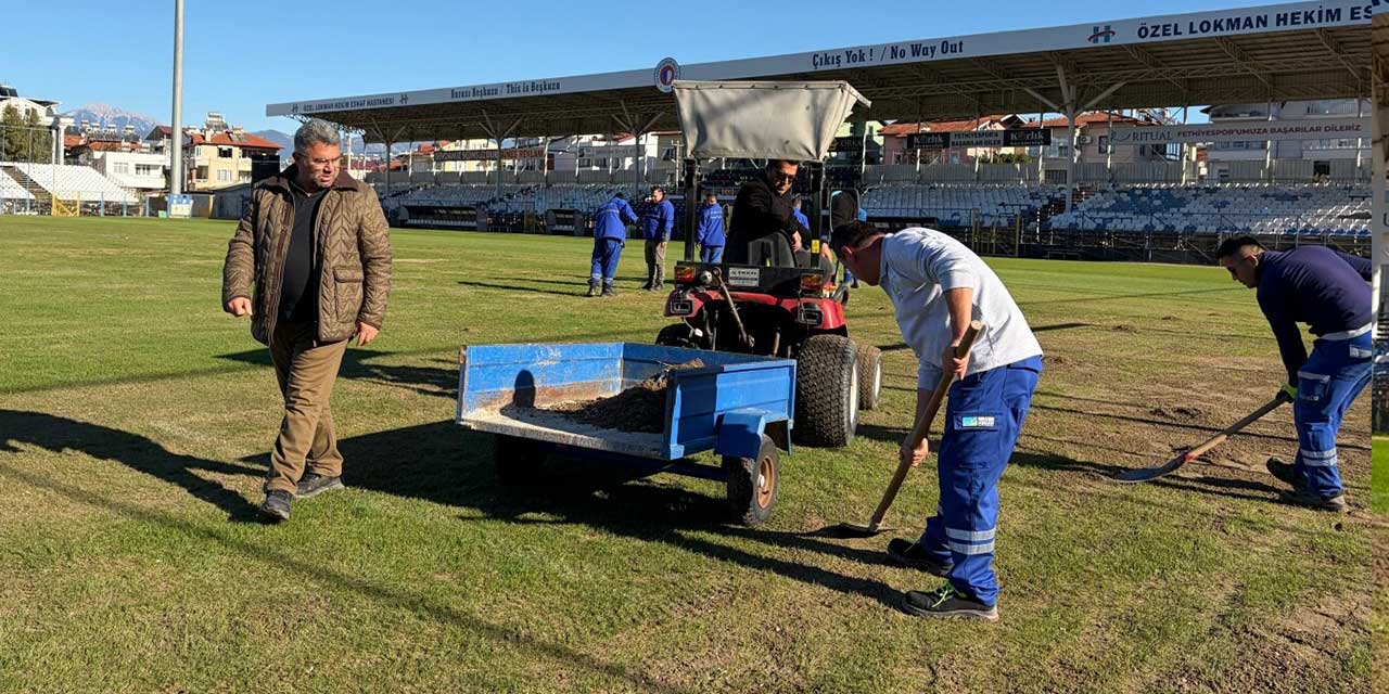 Türkiye Kupası A Grubu'nda 13 Ocak Salı akşamı tarihinde ilk kez Galatasaray'la karşılaşmaya hazırlanan 2'nci Lig Kırmızı Grup ekibi Fethiyespor, Fethiye İlçe Stadı'nda başlatılan tadilat ve zemin bakımı çalışmalarını maça yetiştirmeye çalışıyor.