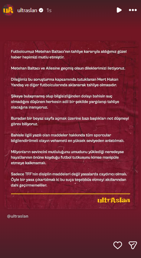 Yasa dışı bahis soruşturması kapsamında tutuklu bulunan Galatasaraylı futbolcu Metehan Baltacı'nın tahliye edilmesi, sarı-kırmızılı camiada büyük sevinç yarattı. Gelişmenin ardından Galatasaray taraftar grubu ultrAslan, yayımladığı bildiriyle Türk futboluna damga vuracak bir çağrıda bulundu.