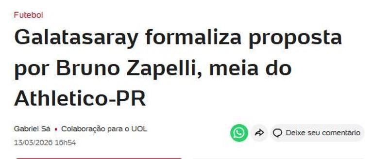 Brezilya basınından UOL'un haberine göre Galatasaray, Bruno Zapelli için Brezilya temsilcisi Athletico Paranaense’ye resmi teklif yaptı.