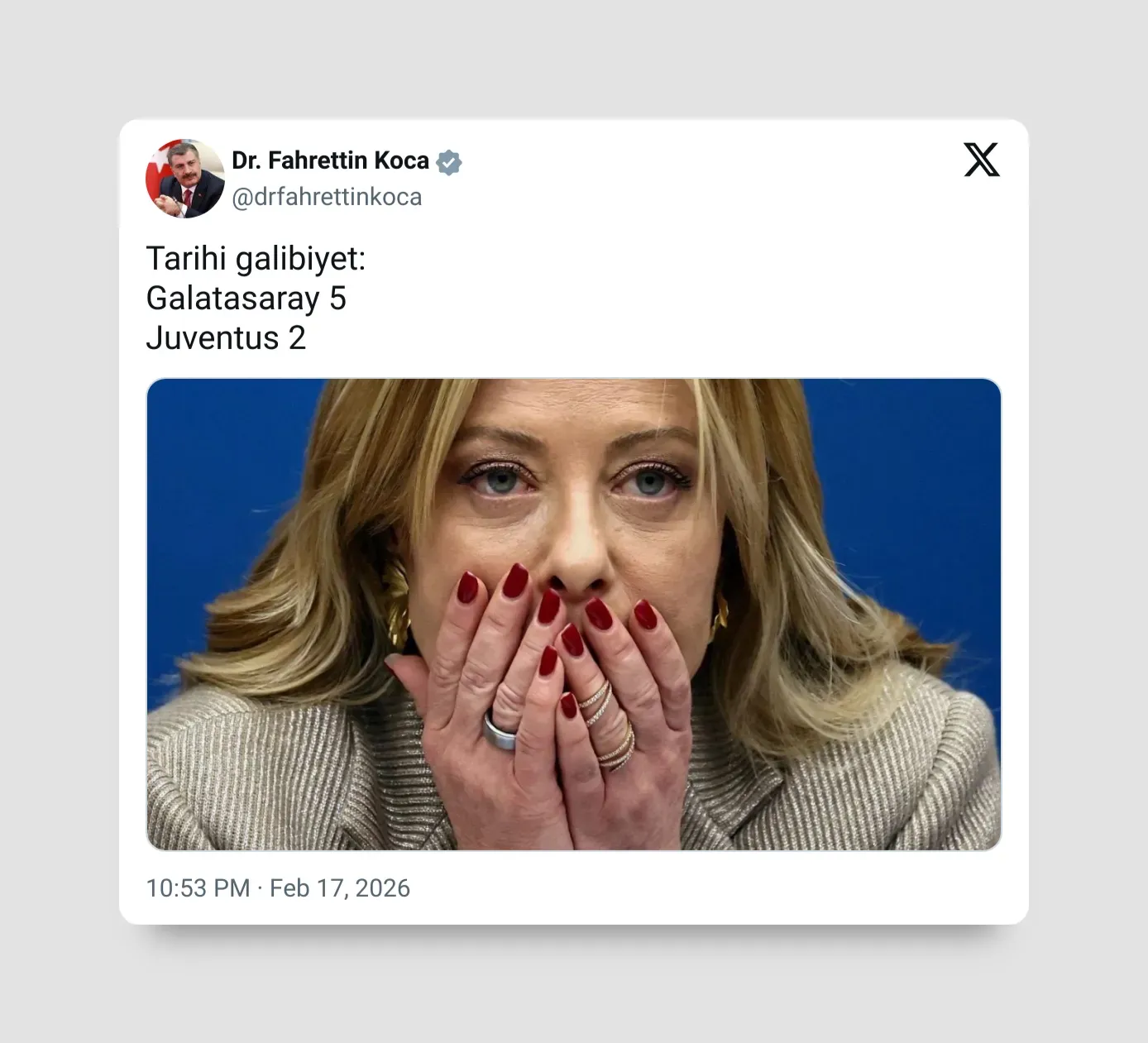 Koca, maç sonrası X hesabından “Tarihi galibiyet: Galatasaray 5 Juventus 2” mesajını paylaştı. Paylaşımına Meloni’nin fotoğrafını da ekledi.