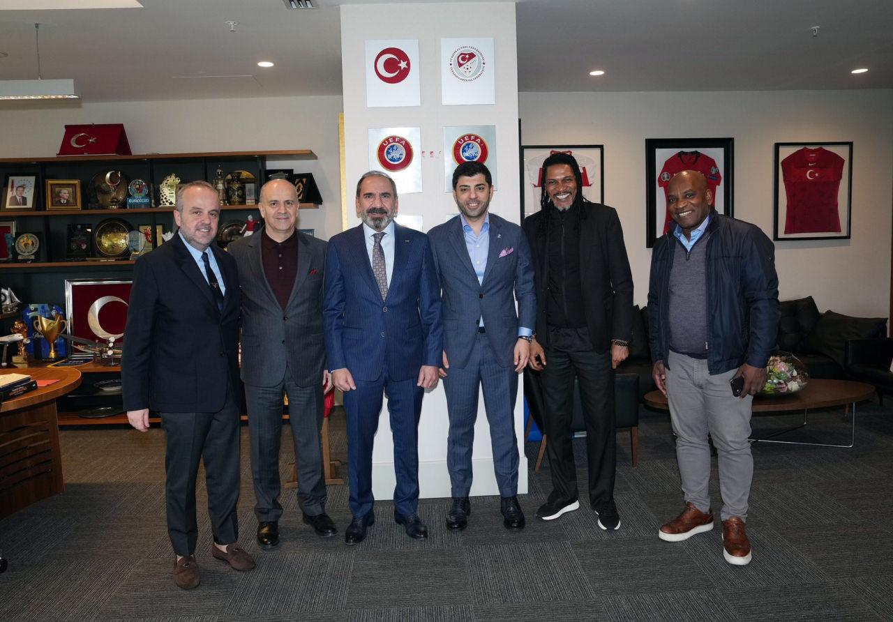 Galatasaray ve Trabzonspor'da forma giyen eski futbolcu ve teknik direktör Rigobert Song, Türkiye Futbol Federasyonu (TFF) Başkanı İbrahim Ethem Hacıosmanoğlu ve TFF Başkan Vekili Mecnun Otyakmaz ile bir araya geldi.