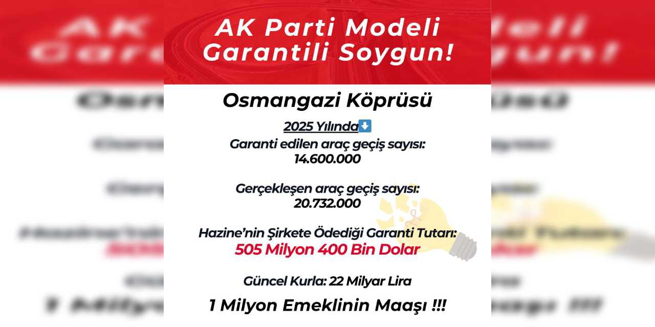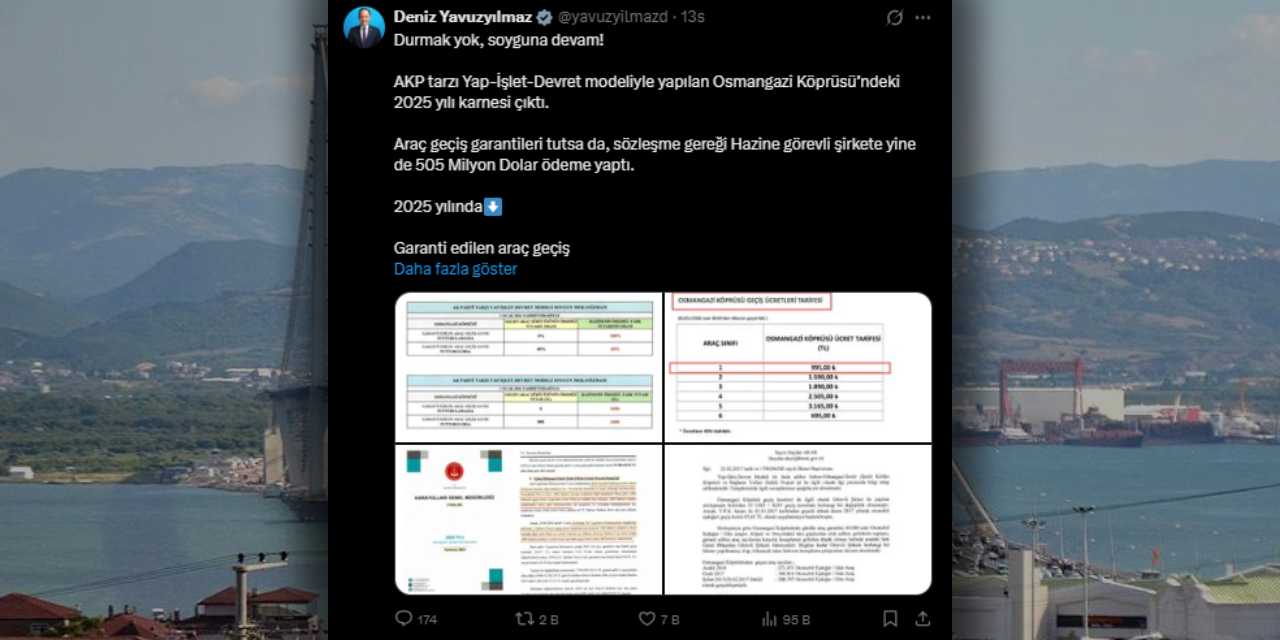 BU KEZ OSMANGAZİ'NİN KAYMAĞINI TOPLADILARDeniz Yavuzyılmaz'ın paylaştığı bilgilere göre; 2025 yılında garanti geçiş sayısının çok üzerinde geçiş yapılmasına rağmen Osmangazi Köprüsü'nün işletme sahibi Otoyol A.Ş.'ye 505 milyon dolar yani yaklaşık 22 milyar lira ödeme yapıldı.