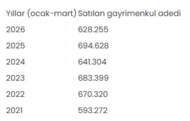 OCAK-MART DÖNEMİ RAKAMLARIÜlke genelinde 2021-2026 yılları ocak-mart dönemleri dikkate alındığında satılan gayrimenkul adetleri şöyle: