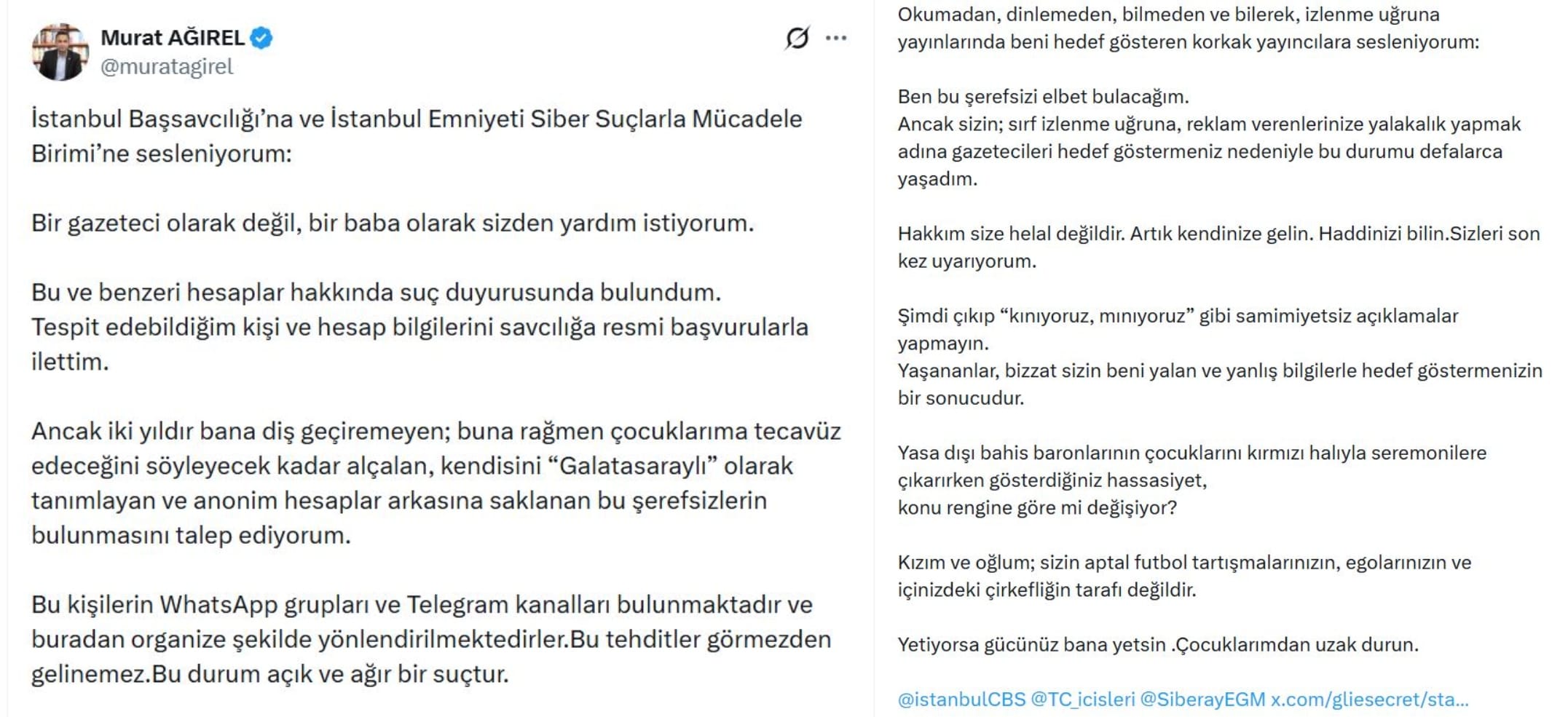 "Ben bu şerefsizi elbet bulacağım. Ancak sizin; sırf izlenme uğruna, reklam verenlerinize yalakalık yapmak adına gazetecileri hedef göstermeniz nedeniyle bu durumu defalarca yaşadım. Hakkım size helal değildir. Artık kendinize gelin. Haddinizi bilin.Sizleri son kez uyarıyorum. Şimdi çıkıp “kınıyoruz, mınıyoruz” gibi samimiyetsiz açıklamalar yapmayın. Yaşananlar, bizzat sizin beni yalan ve yanlış bilgilerle hedef göstermenizin bir sonucudur.Yasa dışı bahis baronlarının çocuklarını kırmızı halıyla seremonilere çıkarırken gösterdiğiniz hassasiyet, konu rengine göre mi değişiyor? Kızım ve oğlum; sizin aptal futbol tartışmalarınızın, egolarınızın ve içinizdeki çirkefliğin tarafı değildir. Yetiyorsa gücünüz bana yetsin. Çocuklarımdan uzak durun."