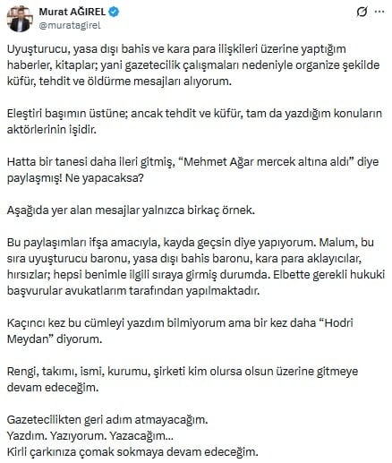Cumhuriyet Gazetesi yazarı Gazeteci Murat Ağırel sosyal medya hesabından dikkat çeken bir paylaşım yaptı. Ağırel son zamanlarda yaptığı uyuşturucu ve kara para trafiğine dair yaptığı haberler, yazdığı kitaplardan sonra ölüm tehditleri aldığını duyurdu.