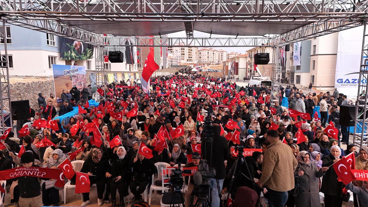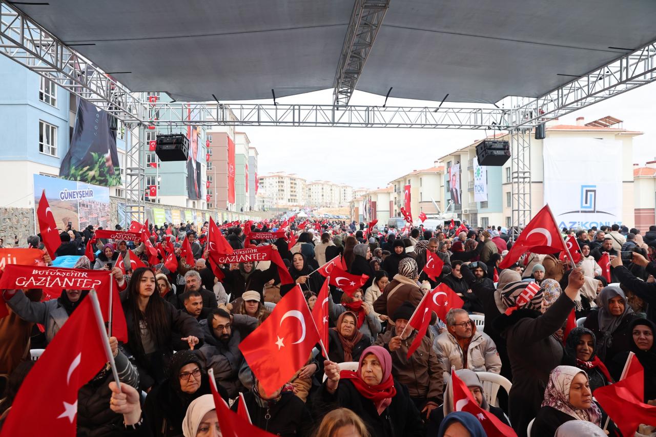 "455 bin konutu teslim ettik. Yeni hastaneler, okullar, yollar, organize sanayiler, küçük sanayi sitelerini inşa ettik. Gaziantep’te 25 bin 237 konut, 4 bin 463 köy evi, bin 353 iş yerini hak sahiplerine teslim ettik. Gaziantep hep söylüyoruz en hızlı toparlanan ilimiz oldu. Bu tesadüf değil. Değerli Büyükşehir Belediye Başkanımızın Gaziantep Modeli dediği hadiseden kaynaklanıyor. Gaziantep Modeli, farklılıklarımız olabilir, farklı düşünebiliriz ama Gaziantep söz konusuyla, Gaziantep’in ortak menfaatleri söz konusuysa hepimiz birlik ve beraberlik içinde hareket ederiz. Bence işin özü bu. Merkezi idare, yerel yönetim, iş dünyası, sivil toplum, meslek kuruluşları, üniversiteler, hepsi aynı hedefe kilitleniyor. Gaziantep bir kalkınma, gelişme modeli. Gaziantep’i bu yönleriyle çok takdir ediyoruz. Bir taraftan büyük bir medeniyet şehri. Aynı zamanda da modern dünyaya hızlı adapte olan, görüntüde değil, gerçek anlamda üretimiyle, girişimciliğiyle, ihracatıyla, dışa açık sanayisiyle, bütün bunlarla hızlı bir şekilde kalkınan, gelişen bir ilimiz. Gaziantep ve Gazianteplilerle iftihar ediyoruz. Gaziantep’i bir örnek olarak anlatmamız lazım."