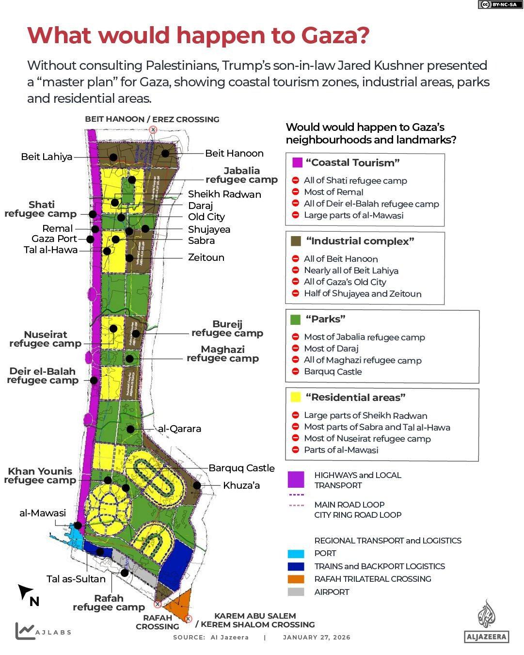 FİLİSTİNLİLERE DANIŞILMADIDoha Enstitüsü'nden Doç. Dr. Tamer Qarmout, Al Jazeera'ye yaptığı açıklamada, "Filistinlilerin bu planda hiçbir söz hakkı yok. İsrail'in işgalinin bitip bitmeyeceğine dair tek bir ifade bile yer almıyor" diyerek tepkisini dile getirdi. Analist Sultan Barakat ise projenin İsrail'in işgal hedefleriyle birebir örtüştüğünü vurgulayarak, "Filistinlileri yerinden etme ve Gazze'den çıkarma fikri sona ermiş değil" uyarısında bulundu.