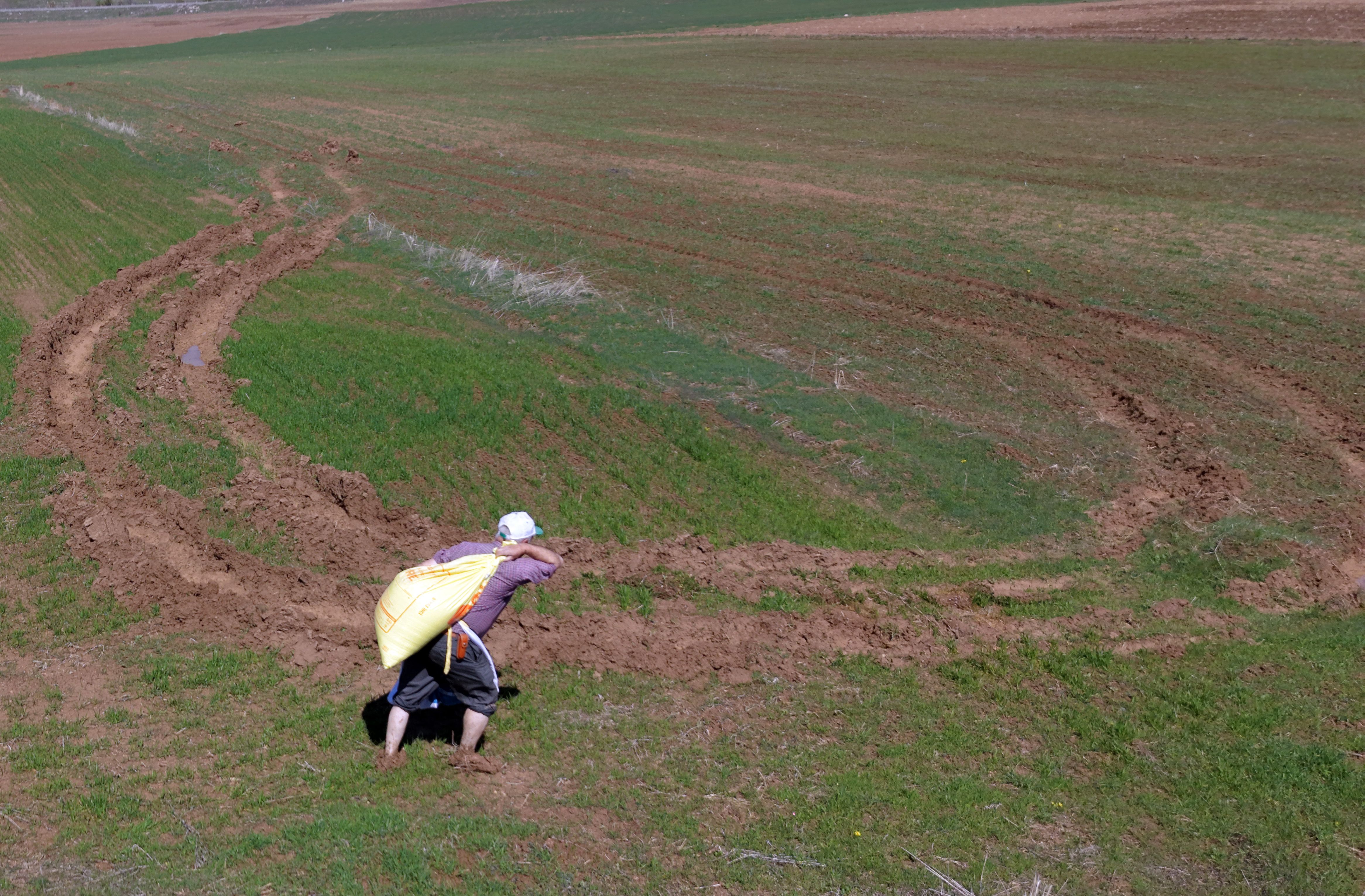 Bölgede üretim yapan bir çiftçinin gübre çuvallarını sırtında taşıyarak balçığa dönüşen tarlada yalın ayak ilerlediği anlar dronla kaydedildi.