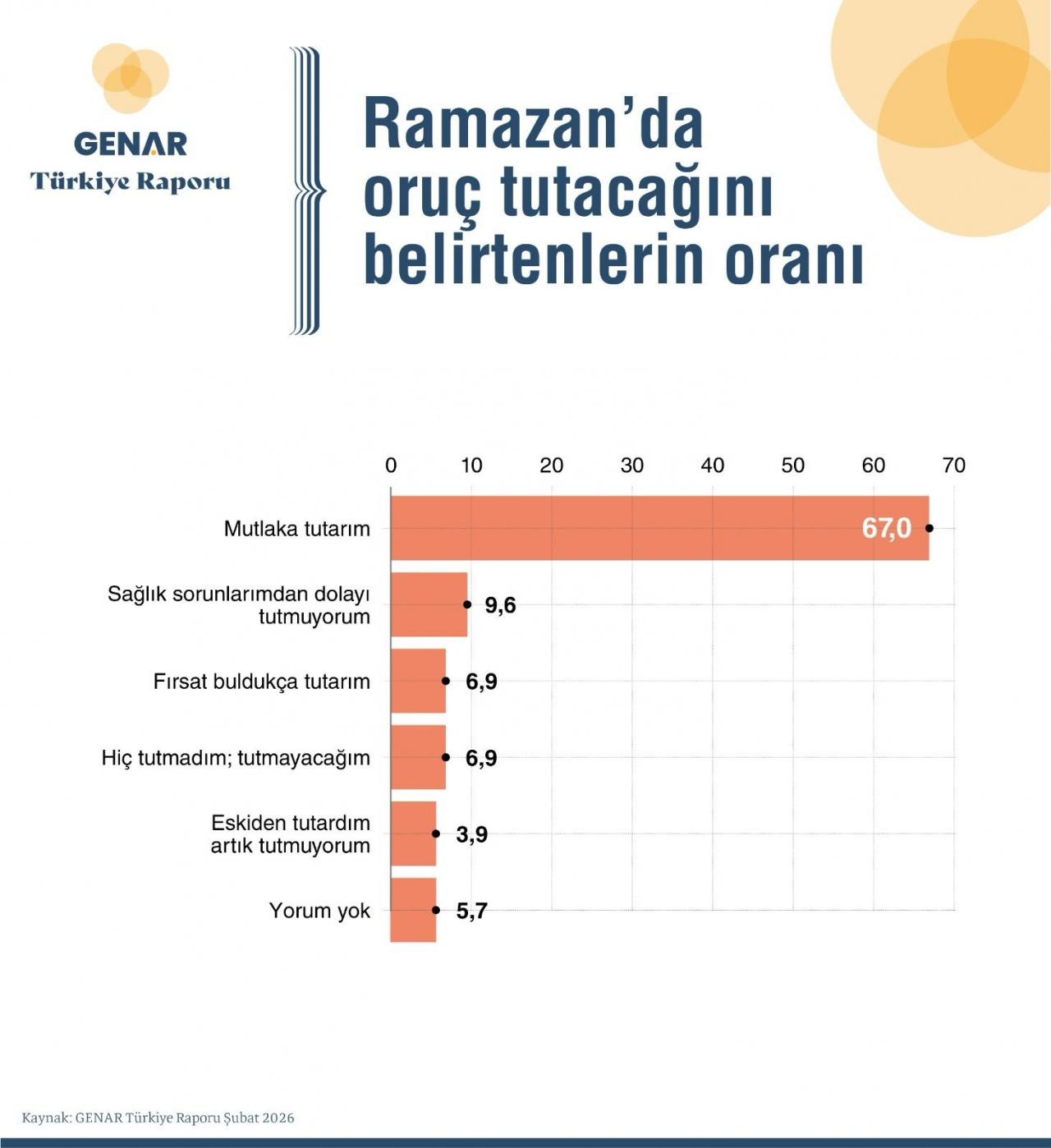 Oruç ibadetine ilişkin veriler de dikkat çekici. Katılımcıların %67’si Ramazan’da “mutlaka oruç tuttuğunu” belirtirken, %6,9’u hiç tutmadığını ya da tutmayacağını ifade ediyor. Sağlık sorunları nedeniyle oruç tutamadığını söyleyenlerin oranı %9,6 olarak ölçüldü. %6,9’luk bir kesim fırsat buldukça oruç tuttuğunu belirtirken, %3,9’u geçmişte tuttuğunu ancak artık tutmadığını ifade ediyor.