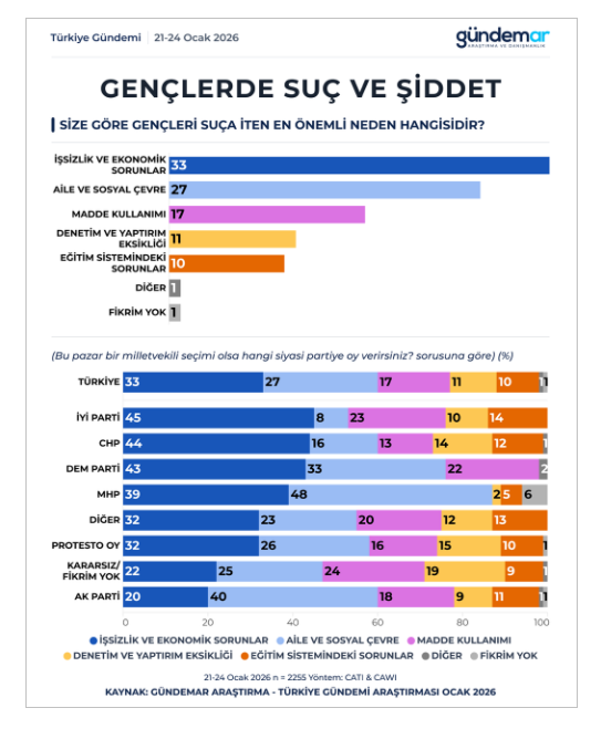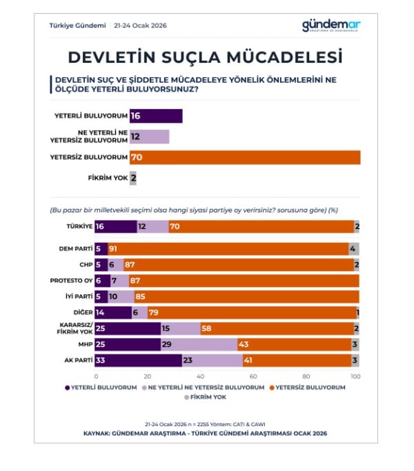 %70: Yetersiz%16: Yeterli%12: Ne yeterli ne yetersizBu sonuç, kamu otoritesine yönelik memnuniyetsizliğin yüksek olduğunu gösterdi. Konuya ilişkin yapılan değerlendirmede, "Ocak 2026 verileri, Türkiye toplumunda güvenlik kaygısının büyüdüğünü, suç olaylarının arttığı yönündeki kanaatin güçlendiğini ve özellikle gençler arasında suç ve şiddet eğilimine ilişkin çok güçlü bir toplumsal alarm oluştuğunu ortaya koyuyor. Kamuoyu, gençlerdeki umutsuzluk ile suç ve şiddet arasında doğrudan bağ kuruyor; bu sorunun temel nedenlerini ise öncelikle ekonomik darboğaz, aile ve sosyal çevre ile madde kullanımı ekseninde değerlendiriyor. Aynı zamanda ceza sistemine duyulan güvenin zayıf olması ve devletin mücadele kapasitesinin yetersiz bulunması, toplumun meseleyi yalnızca asayiş değil, aynı zamanda adalet ve kamu otoritesi sorunu olarak gördüğünü düşündürüyor. Araştırmanın ortaya koyduğu temel mesaj açık: Toplum, suç ve şiddet karşısında daha etkili, daha görünür ve daha güven veren bir mücadele talep ediyor" ifadelerine yer verildi.