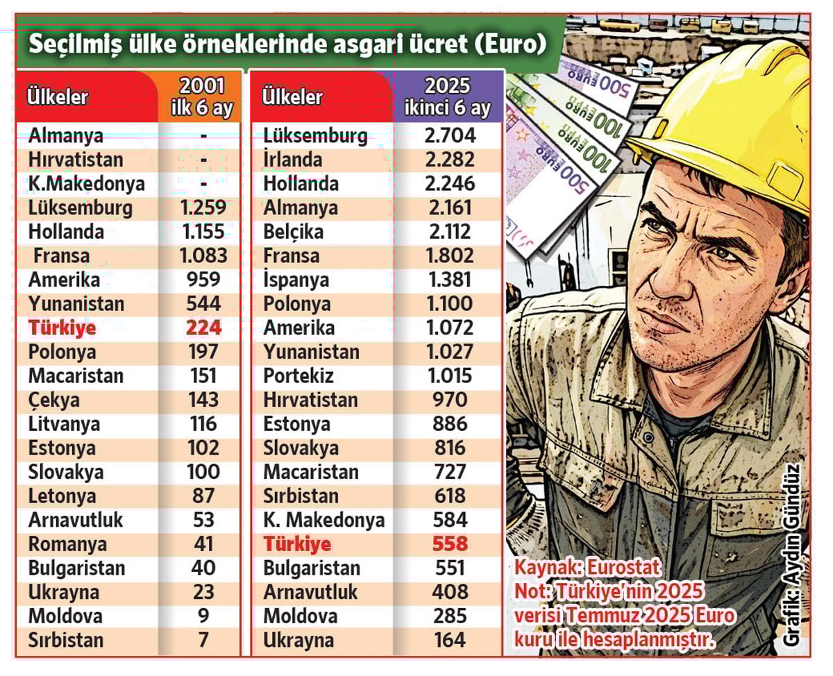 Eurostat verilerine göre 2001 yılında Türkiye, geçerli asgari ücret ile 13 ülkeyi geride bırakırken, aynı ülkelerle kıyasladığımızda 2025 yılının ikinci yarısı itibarıyla sadece dört ülkeyi geride bırakabildik. Yani alt lige düştük. Asgari ücretlimiz 2001 yılına göre pek çok ülke vatandaşına oranla geriye gitmiş veya onlar kadar artış alamamıştır. Anlaşılan enflasyona ezdirilirken, refahtan payımızı da alamadık.