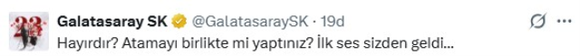 GALATASARAY'DAN FENERBAHÇE'NİN PAYLAŞIMINA CEVAPFenerbahçe'nin bu paylaşımın ardından ise Galatasaray cephesinden cevap gecikmedi. Sarı-lacivertlilerin yaptığı paylaşımı alıntılayan sarı-kırmızılı kulüp, paylaşımda "Hayırdır? Atamayı birlikte mi yaptınız? İlk ses sizden geldi…" ifadelerini kullandı..