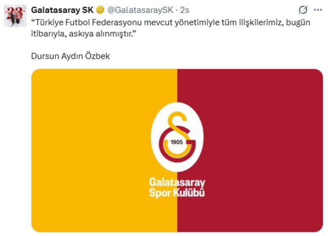 GALATASARAY TFF İLE İLİŞKİLERİNİ ASKIYA ALDISüper Lig'de pazar günü oynanacak Galatasaray-Fenerbahçe derbisinin hakeminin belli olmasının ardından Galatasaray'ın sosyal medya hesabından bir paylaşım yapıldı. Sarı-kırmızılı kulübün başkanı Dursun Özbek, "Türkiye Futbol Federasyonu mevcut yönetimiyle tüm ilişkilerimiz, bugün itibarıyla, askıya alınmıştır.” ifadelerini kullandı.