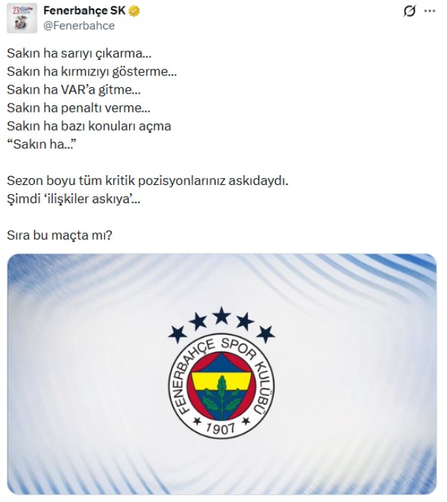 FENERBAHÇE'DEN JET YANIT GELDİGalatasaray'ın bu kararına Fenerbahçe'den jet tepki geldi. Fenerbahçe'den yapılan açıklamada, "Sakın ha sarıyı çıkarma… Sakın ha kırmızıyı gösterme… Sakın ha VAR’a gitme… Sakın ha penaltı verme… Sakın ha bazı konuları açma “Sakın ha…” Sezon boyu tüm kritik pozisyonlarınız askıdaydı. Şimdi ‘ilişkiler askıya’… Sıra bu maçta mı?" ifadeleri kullandı.