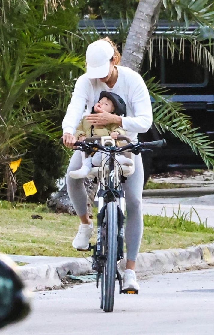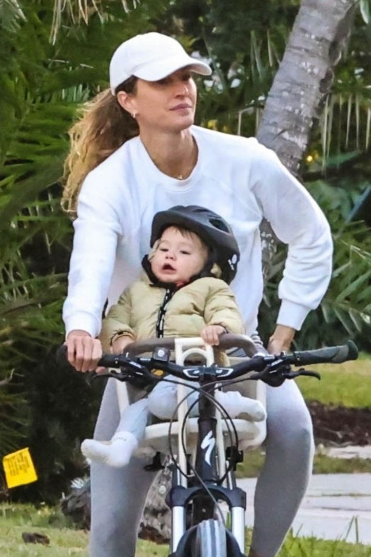 Miami sokaklarında bisiklet süren Gisele Bündchen, kendi beyzbol şapkası takarken, oğluna koruyucu bir kask takmıştı.