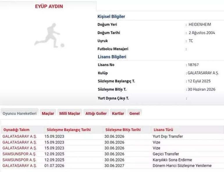 Galatasaray'ın genç futbolcusu Eyüp Aydın ile ilgili flaş bir gelişme duyuruldu. Sezon başında tecrübesi kazanması adına Samsunspor'a kiralanan oyuncu devre arasında takımına geri döndü.