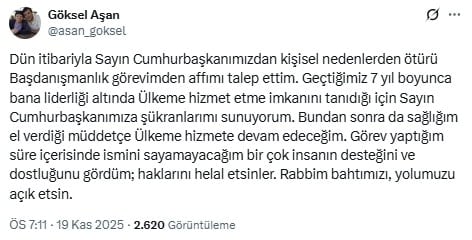 “Dün itibarıyla Sayın Cumhurbaşkanımızdan, kişisel sebepler dolayısıyla Başdanışmanlık görevimden affımı talep ettim. Son yedi yılda, kendisinin liderliği altında ülkeme hizmet etme fırsatı verdiği için şükran duyuyorum. Sağlığım el verdiği sürece ülkeme hizmet etmeyi sürdüreceğim. Görev sürem boyunca destek ve dostluklarını gördüğüm isimlerin hakkını helal etmelerini diliyorum. Rabbim yolumuzu ve bahtımızı açık etsin.”