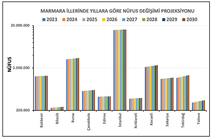 Marmara bölgesindeki 11 ilin toplam nüfusunun TÜİK (2025) verilerine göre 26 milyon 900 civarında olduğuna dikkat çekilen yazıda, "Türkiye nüfusunun yüzde 31’i Marmara bölgesinde yaşamaktadır. 2030 yılında 11 ilin nüfusu 28 milyona ulaşacağı tahmin edilmektedir İstanbul 16 milyon, Bursa 3.3 milyon ve Kocaeli 2.2 milyon nüfusları ile ilk üç sırayı paylaşmaktadır. İstanbul, bölge nüfusunun yarısından çoğunu barındırır.” ifadelerine yer verildi.