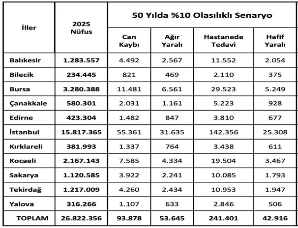 OLASI BİR DEPREMDE KAYIPLARIN BOYUTUNU GÖZLER ÖNÜNE SERDİ!Eyüdoğan, sözlerinin devamında Marmara’da olası bir deprem durumunda yaşanabilecek kayıpları anlatarak “Büyüklüğü 7.0 ve daha büyük depremler bölge depremleridir. Marmara’da hangi fay kolu üzerinde olursa olsun büyük deprem il sınırı ve ilçe sınırı tanımaz. Dolayısıyla büyük depremi merkez alıp 100 km yarıçaplı bir daire alanı içerisinde kalan dayanıksız yapılarda çeşitli derecelerde hasar ve can kayıpları olması beklenir.” ifadelerine yer verdi.