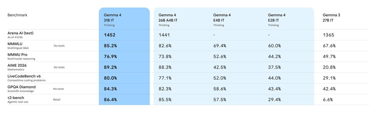 Effective 2B (E2B) Effective 4B (E4B) 26B Mixture of Experts (MoE) 31B Dense '20 KAT DAHA BÜYÜK MODELLERİ GERİDE BIRAKTILAR'Google, Gemma 4'ün "parametre başına eşi benzeri görülmemiş bir zeka seviyesi sunduğunu" iddia ediyor. Şirket, Gemma 4'ün 31 milyar ve 26 milyar parametreli varyantlarının Arena AI'nin metin liderlik tablosunda sırasıyla üçüncü ve altıncı sıraları aldığını ve kendilerinden 20 kat daha büyük modelleri geride bıraktığını söylüyor.