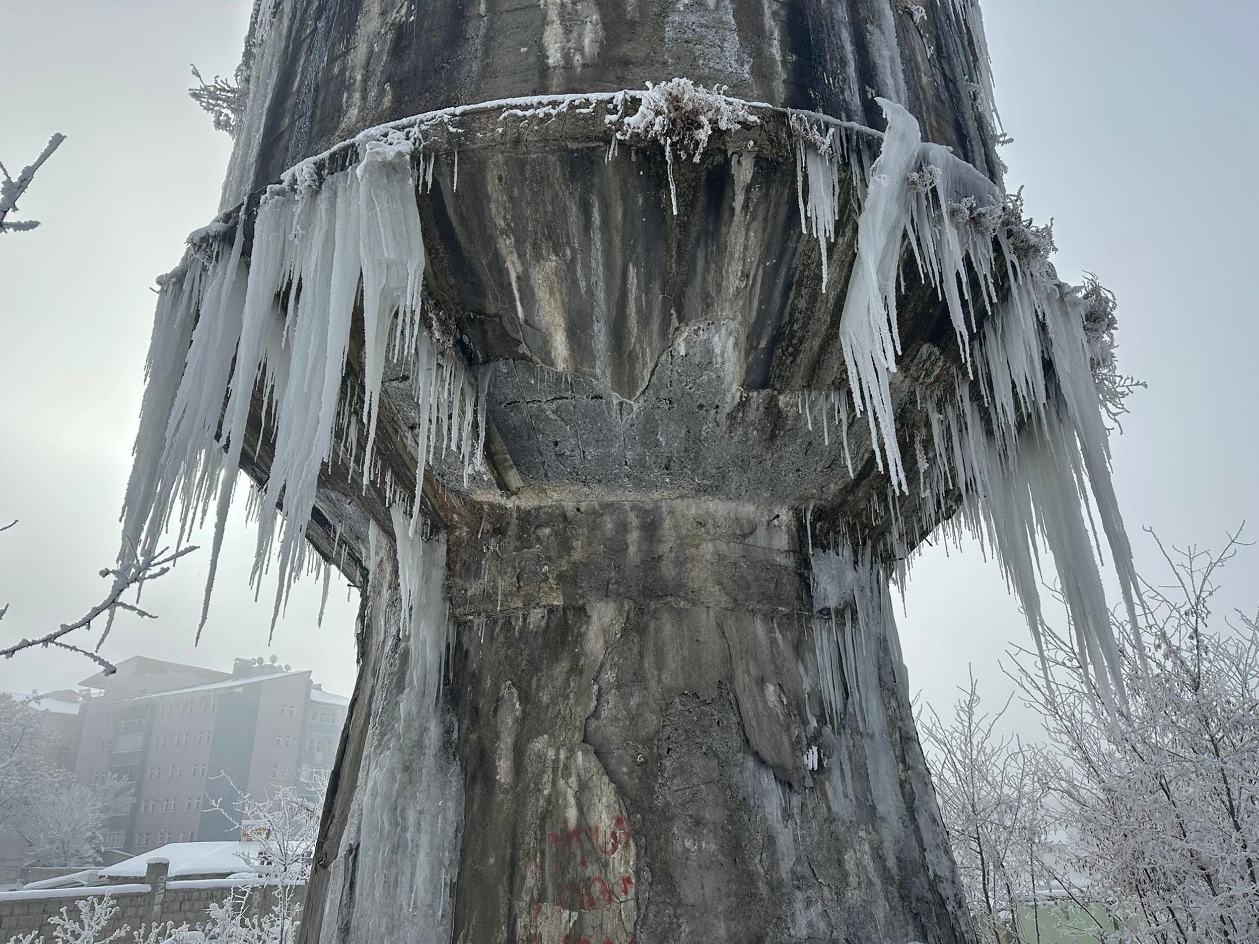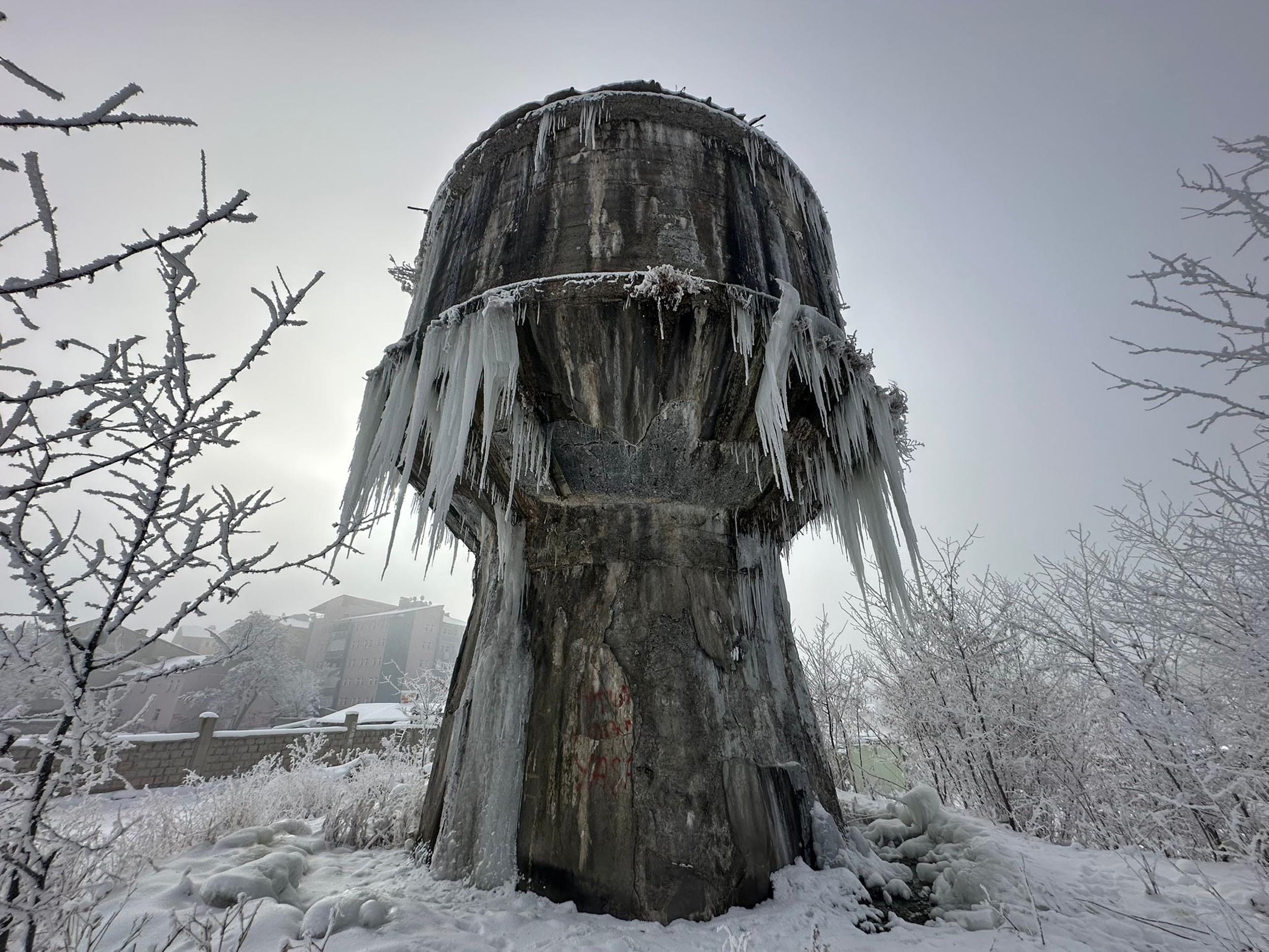 BUZDAN BİR HEYKEL VE ALTYAPI GERÇEĞİKent merkezinde termometrelerin eksi 19,1 dereceyi gösterdiği gece, sadece canlılar için değil, şehir şebekesi ve yapılar için de sınırların zorlandığı bir zaman dilimi oldu. Mezarlık içerisindeki eski su deposunda meydana gelen sızıntı, ekstrem soğukla birleşince 20 metrelik yapıyı tamamen buzla kapladı.