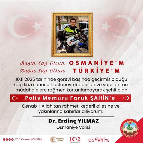 Osmaniye İl Emniyet Müdürlüğü tarafından paylaşılan başsağlığı mesajında, “10 Kasım günü Trafik Tescil ve Denetleme Şube Müdürlüğümüz kadrosunda görevli meslektaşımız polis memuru Faruk Şahin, görevi esnasında geçirdiği kalp krizi sonucu hastaneye kaldırılmış ve yapılan tüm müdahalelere rağmen kurtarılamayarak şehit olmuştur. Kahraman şehidimize Allah'tan rahmet, yakınlarına ve milletimize başsağlığı dileriz” denildi.