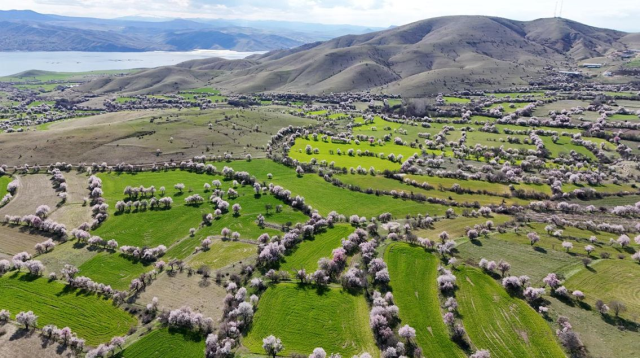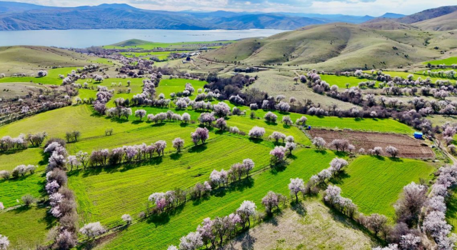 Baharın habercisi olarak görülen badem çiçekleri, ilçe sakinleri ve fotoğraf tutkunlarının ilgisini çekerken, oluşan manzara dron ile havadan da görüntülendi.