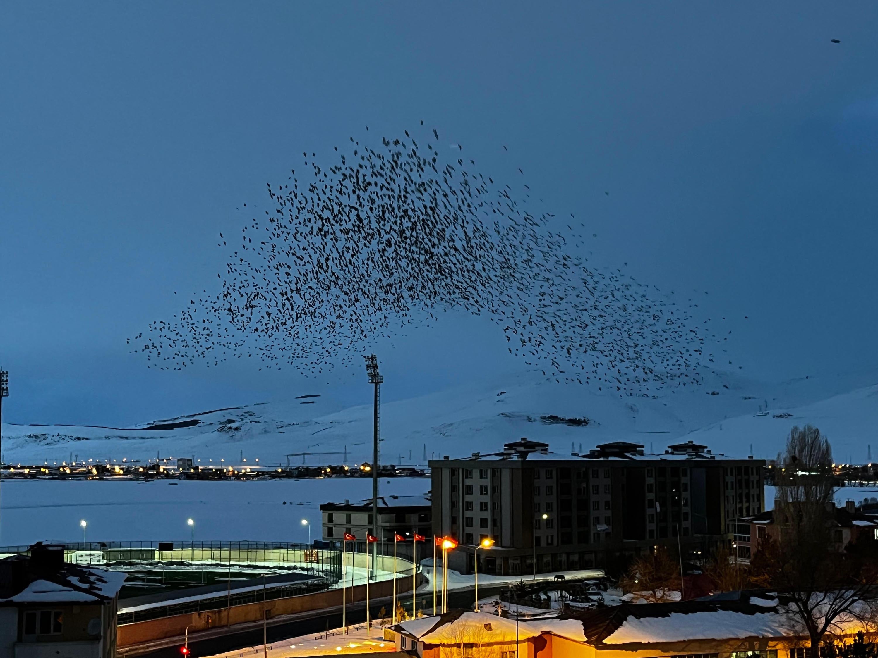 Kentte dün akşam saatlerinde kargalar, sürüler halinde dakikalar boyunca gökyüzünde daireler çizerek uçuş yaptı.