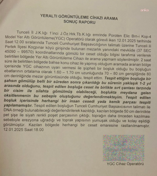 MEZARA BENZER BOŞLUKSavcılık talimatıyla Koçpınar Köyü'nde 12 Ocak 2025 tarihinde kazı çalışması yapıldı. Söz konusu kazı çalışmasına ilişkin “Yeraltı Görüntüleme Cihazı Arama Sonuç Raporu” soruşturma dosyasına girdi.