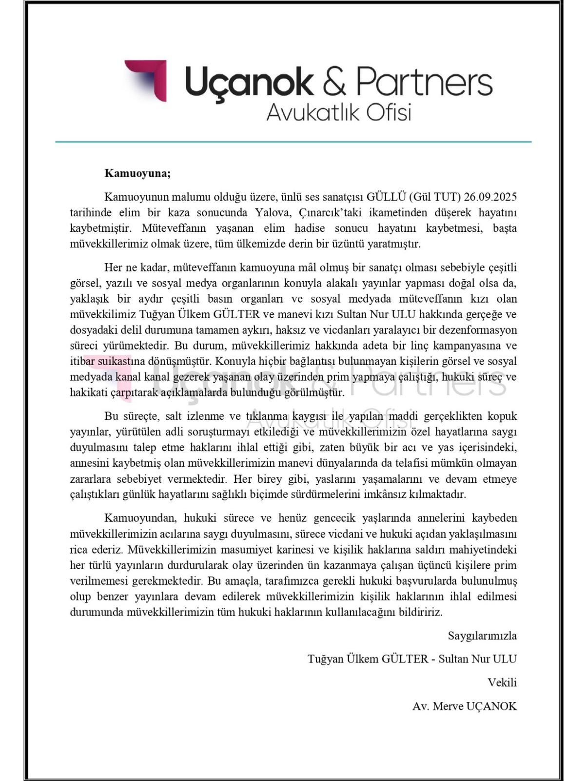 “Kamuoyunun malumu olduğu üzere, ünlü ses sanatçısı Güllü (Gül Tut) 26.09.2025 tarihinde elim bir kaza sonucunda Yalova, Çınarcık'taki ikametinden düşerek hayatını kaybetmiştir. Müteveffanın yaşanan elim hadise sonucu hayatını kaybetmesi, başta müvekkillerimiz olmak üzere, tüm ülkemizde derin bir üzüntü yaratmıştır. Her ne kadar, müteveffanın kamuoyuna mâl olmuş bir sanatçı olması sebebiyle çeşitli görsel, yazılı ve sosyal medya organlarının konuyla alakalı yayınlar yapması doğal olsa da yaklaşık bir aydır çeşitli basın organları ve sosyal medyada müteveffanın kızı olan müvekkilimiz Tuğyan Ülkem Gülter ve manevi kızı Sultan Nur Ulu hakkında gerçeğe ve dosyadaki delil durumuna tamamen aykırı, haksız ve vicdanları yaralayıcı bir dezenformasyon süreci yürümektedir. Bu durum, müvekkillerimiz hakkında adeta bir linç kampanyasına ve itibar suikastına dönüşmüştür. Konuyla hiçbir bağlantısı bulunmayan kişilerin görsel ve sosyal medyada kanal kanal gezerek yaşanan olay üzerinden prim yapmaya çalıştığı, hukuki süreç ve hakikati çarpıtarak açıklamalarda bulunduğu görülmüştür. Bu süreçte, salt izlenme ve tıklanma kaygısı ile yapılan maddi gerçeklikten kopuk yayınlar, yürütülen adli soruşturmayı etkilediği ve müvekkillerimizin özel hayatlarına saygı duyulmasını talep etme haklarını ihlal ettiği gibi, zaten büyük bir acı ve yas içerisindeki, annesini kaybetmiş olan müvekkillerimizin manevi dünyalarında da telafisi mümkün olmayan zararlara sebebiyet vermektedir. Her birey gibi, yaslarını yaşamalarını ve devam etmeye çalıştıkları günlük hayatlarını sağlıklı biçimde sürdürmelerini imkansız kılmaktadır.”