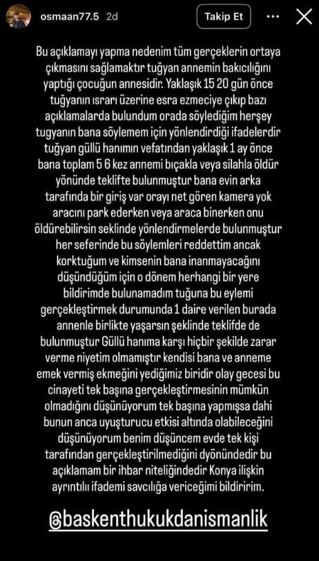 Osman Yıldız; "Bu açıklamayı yapma nedenim tüm gerçeklerin ortaya çıkmasını sağlamaktır. Tuğyan, annemin bakıcılığını yaptığı çocuğun annesidir. Yaklaşık 15 - 20 gün önce Tuğyanın ısrarı üzerine çıkıp bazı açıklamalarda bulundum. Orada söylediğim her şey Tuğyan'ın bana söylemem için yönlendirdiği ifadelerdir. Tuğyan, Güllü hanımın vefatından yaklaşık 1 ay önce bana 5 - 6 kez 'annemi bıçakla veya silahla öldür' yönünde teklifte bulunmuştur. Bana, 'evin arka tarafında bir giriş var orayı net gören kamera yok aracını park ederken veya araca binerken onu öldürebilirsin' şeklinde yönlendirmelerde bulunmuştur. Her seferinde bu söylemleri reddettim ancak korktuğum ve kimsenin bana inanmayacağını düşündüğüm için o dönem, herhangi bir yere bildirimde bulunamadım. Tuğyan, bu eylemi gerçekleştirmem durumunda 1 daire vereceğini ve burada annenle birlikte yaşarsın şeklinde teklifte de bulunmuştur. Güllü hanıma karşı hiçbir şekilde zarar verme niyetim olmamıştır. Kendisi bana ve anneme emek vermiş, ekmeğini yediğimiz biridir. Olay gecesi, bu cinayeti tek başına gerçekleştirmesinin mümkün olmadığını düşünüyorum. Tek başına yapmışsa dahi bunun ancak uyuşturucu etkisi altında olabileceğini düşünüyorum. Benim düşüncem evde tek kişi tarafından gerçekleştirilmediği yönündedir. Bu açıklamam bir ihbar niteliğindedir. Konuya ilişkin ayrıntılı ifademi savcılığa vereceğimi bildiririm" dedi.