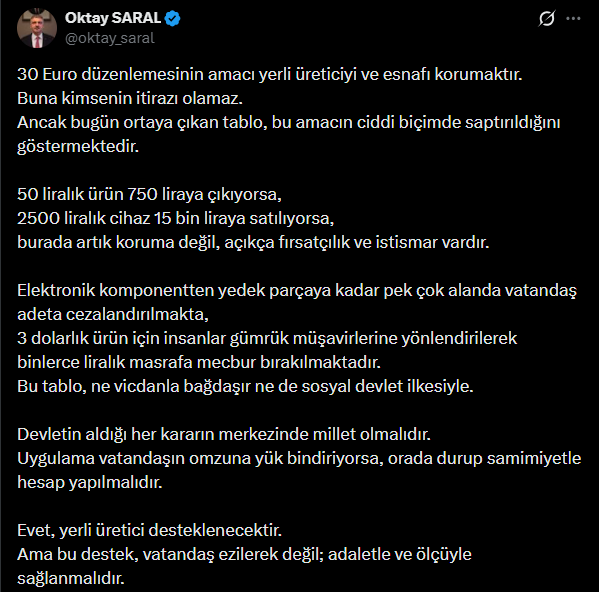 Cumhurbaşkanı Başdanışmanı Oktay Saral, sosyal medya hesabından yaptığı paylaşım ile yurt dışı alışverişlerde 30 avroluk gümrük muafiyetinin kaldırılmasının ardından birçok üründe yaşanan fahiş fiyat artışlarına tepki gösterdi.