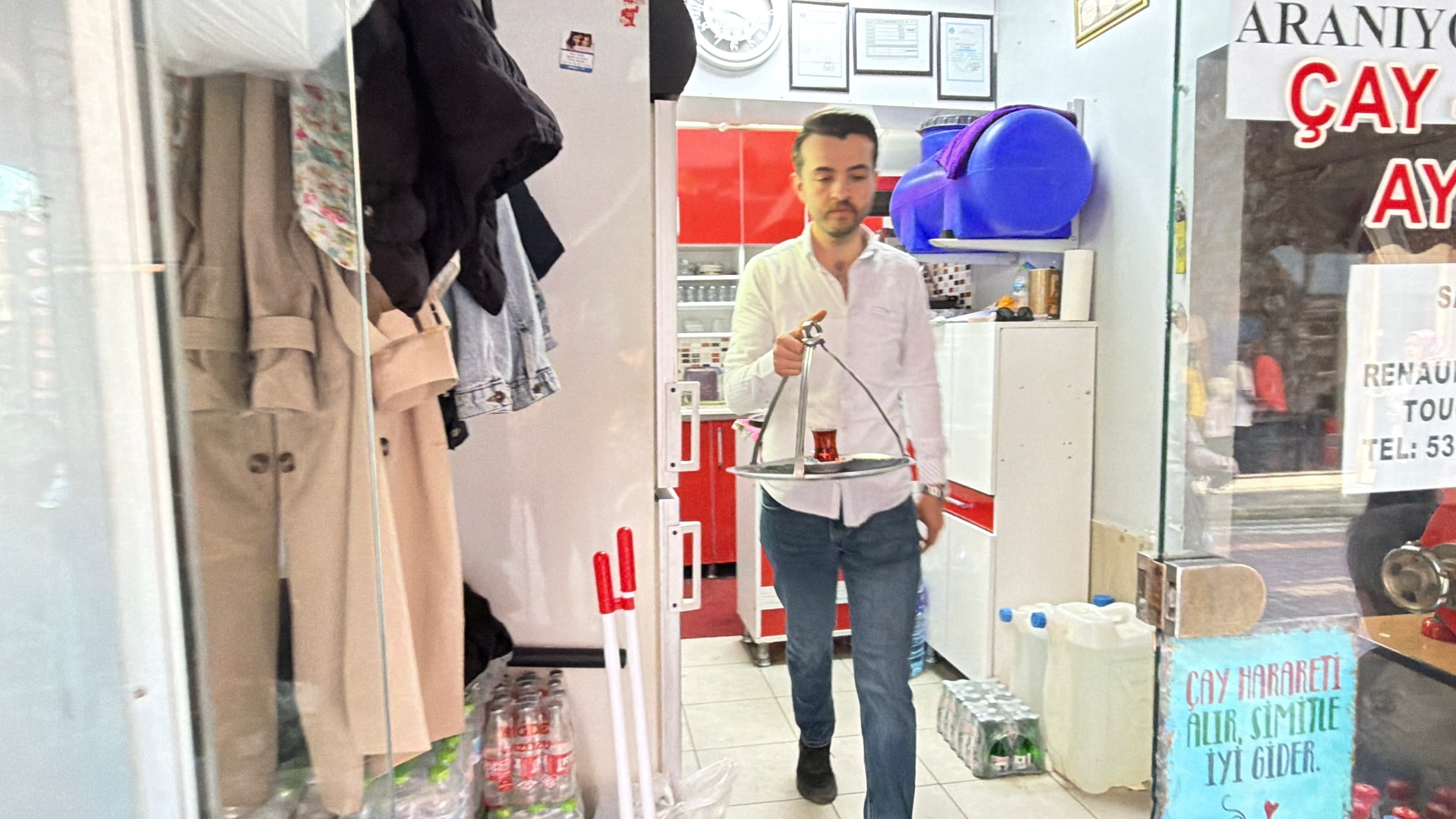 Her gün 25 binin üzerinde adım attığı için yorulan Basri Akbıyık, dükkanına uzak mesafedeki esnafın servisin geç gelmesi ve çayın soğuk olması gibi şikayetleri de eklenince farklı bir yönteme başvurdu.