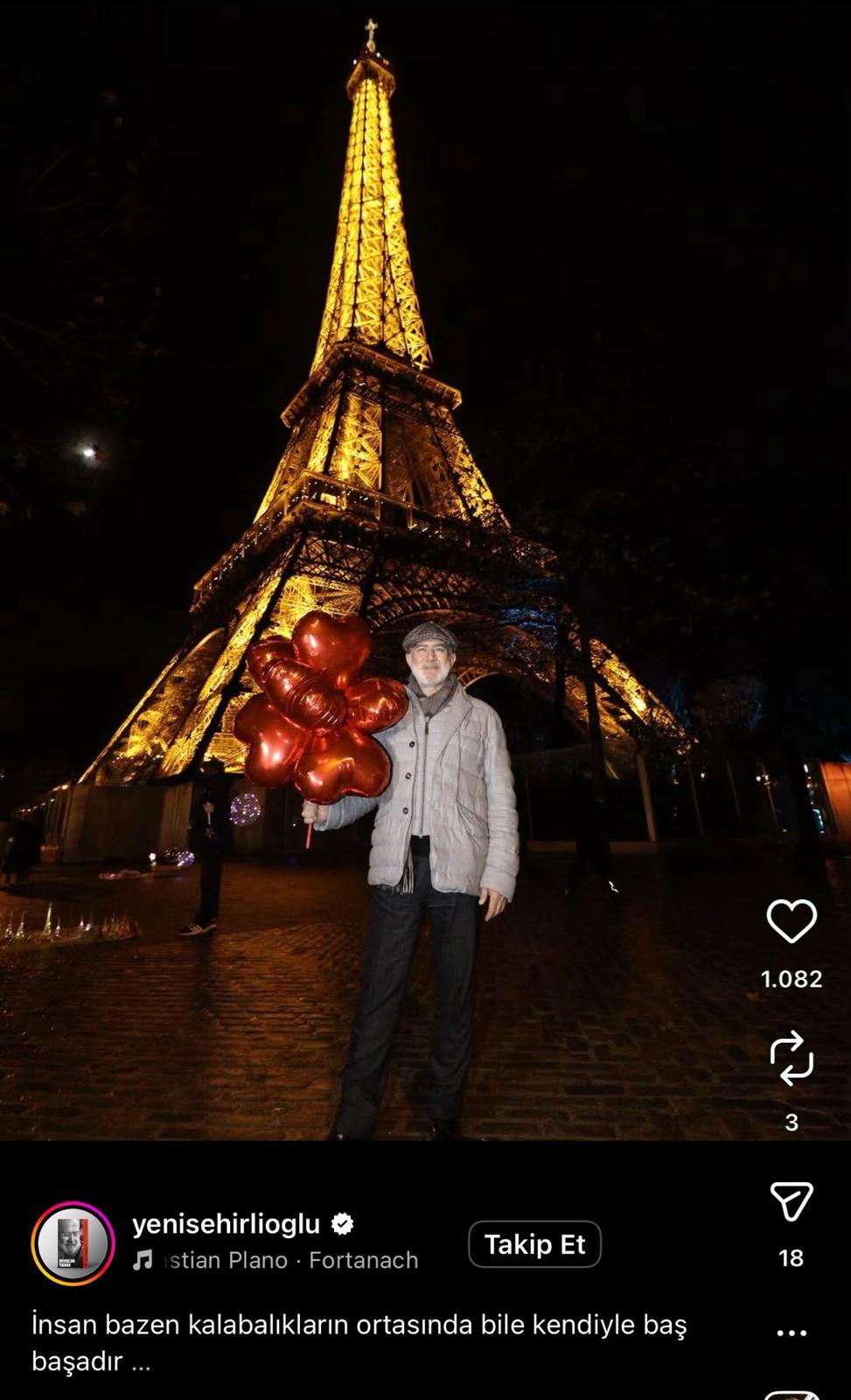 Paris'in simgesi Eyfel Kulesi'nin önüne giden Yenişehirlioğlu, elinde tuttuğu kırmızı kalp şeklindeki uçan balonlarla poz verdi. Fotoğrafın altına "İnsan bazen kalabalıkların ortasında bile kendiyle baş başadır..." notunu düşen Yenişehirlioğlu, bu kareyi kısa bir süre sonra yayından kaldırdı.