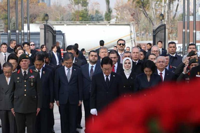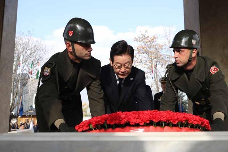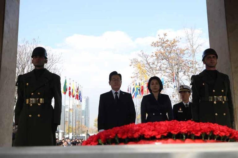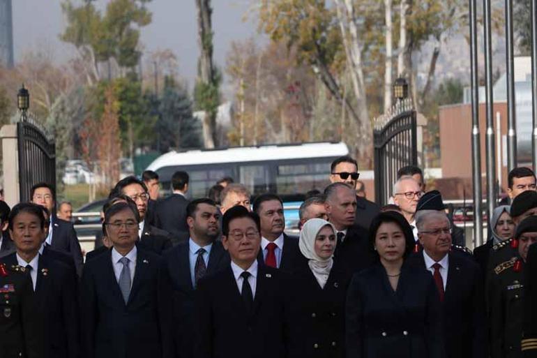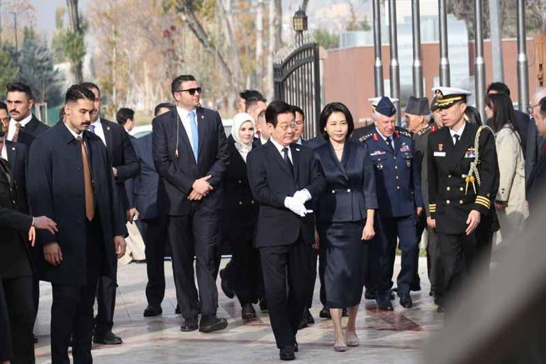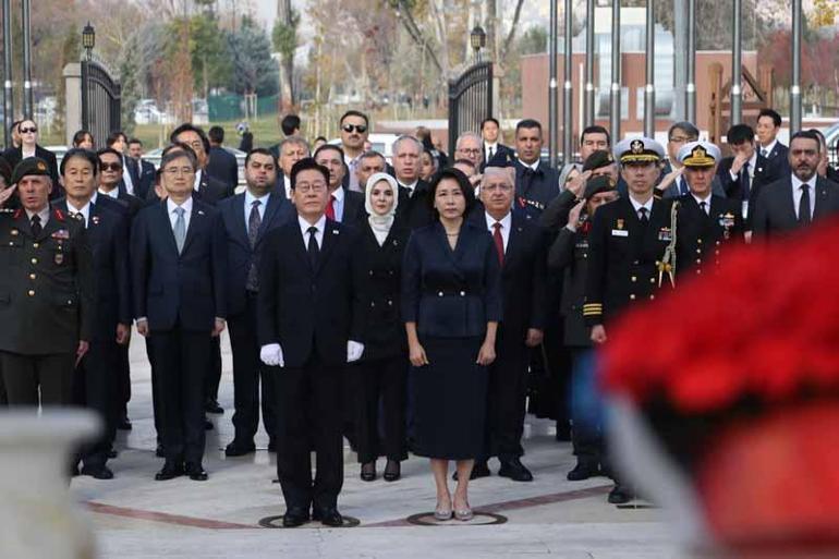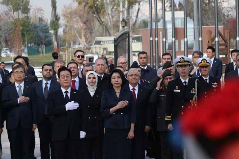 Cumhurbaşkanı Recep Tayyip Erdoğan'ın davetiyle Türkiye'ye resmi ziyaret gerçekleştiren Güney Kore Cumhurbaşkanı Lee Jae Myung ile eşi Kim Hea Kyung, Ankara'nın Altındağ ilçesindeki 'Kore'de Savaşan Türkler Anıtı'nı ziyaret etti. Ziyarette Cumhurbaşkanı Lee'ye; Milli Savunma Bakanı Yaşar Güler, Aile ve Sosyal Hizmetler Bakanı Mahinur Özdemir Göktaş, Genelkurmay Başkanı Orgeneral Selçuk Bayraktaroğlu, Kara Kuvvetleri Komutanı Orgeneral Metin Tokel ve Hava Kuvvetleri Komutanı Orgeneral Ziya Cemal Kadıoğlu eşlik etti. Kore'de savaşan gaziler ve yakınlarının da hazır bulunduğu törende, Güney Kore Cumhurbaşkanı Lee ile eşi Kim, kırmızı ve mavi karanfillerden hazırlanan çelengi anıta bıraktı. Askeri bandonun iki ülke marşlarını çalmasının ardından Güney Kore Cumhurbaşkanı Lee, gazilerin yanına giderek selamlaştı. Ardından gazilere, 'Kore Ginseng'i adındaki özel bitkiden oluşan hediye takdim edildi. Tören, hediye takdiminin ardından son buldu.