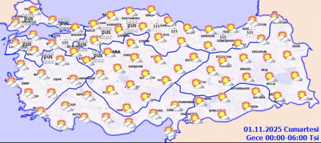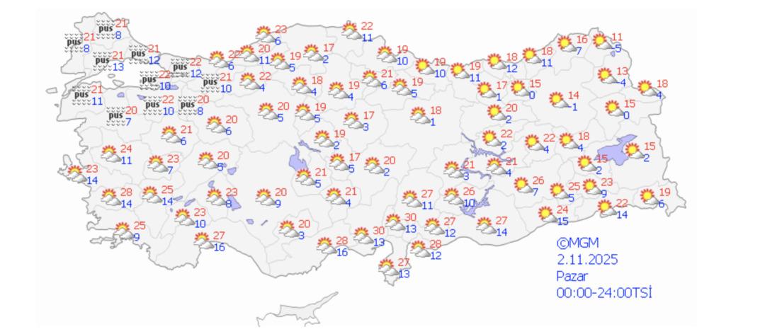 Yurdun kuzey, iç ve batı kesimleri parçalı bulutlu, diğer bölgeler ise az bulutlu ve açık geçecek. Sabah ve gece saatlerinde Marmara, Ege'nin kuzeydoğusu, İç Anadolu'nun kuzeybatısı ile Karadeniz'in iç kesimlerinde pus ve yer yer sis oluşması öngörülüyor.