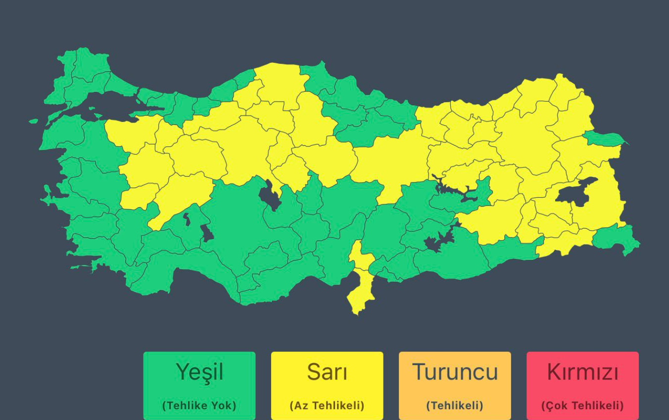 Meteoroloji Genel Müdürlüğü (MGM) tarafından yapılan son değerlendirmelerin ardından, İçişleri Bakanlığı, hafta sonu için 38 ile sarı kodlu yarıda bulundu.