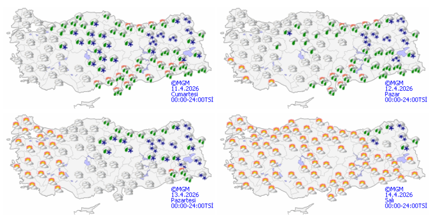 Buna göre Marmara'nın kuzeyi, Doğu Akdeniz, İç Anadolu, Karadeniz ile Doğu ve Güneydoğu'da aralıklı yağışlar bekleniyor.