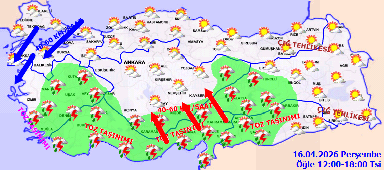 Ayrıca, Kuzey Afrika kaynaklı toz taşınımının Kıyı Ege ve Akdeniz kıyılarında 16 Nisan Perşembe gece saatlerine kadar etkili olacağı, bu durumun hava kalitesinde düşüş ve ulaşımda aksamalara yol açabileceği bildirildi.