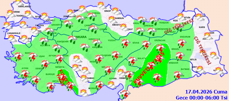 DOĞU ANADOLUParçalı ve az bulutlu, zamanla çok bulutlu, öğle saatlerinden sonra batısı ile Erzurum, Muş ve Bingöl çevrelerinin sağanak ve gök gürültülü sağanak yağışlı geçeceği tahmin ediliyor. Yağışların Tunceli ve Elazığ çevrelerinde yerel kuvvetli olması bekleniyor. Bölgenin doğusunun yüksek kar örtüsüne sahip eğimli kesimlerinde çığ ve kar erime tehlikesi bulunmaktadır.
