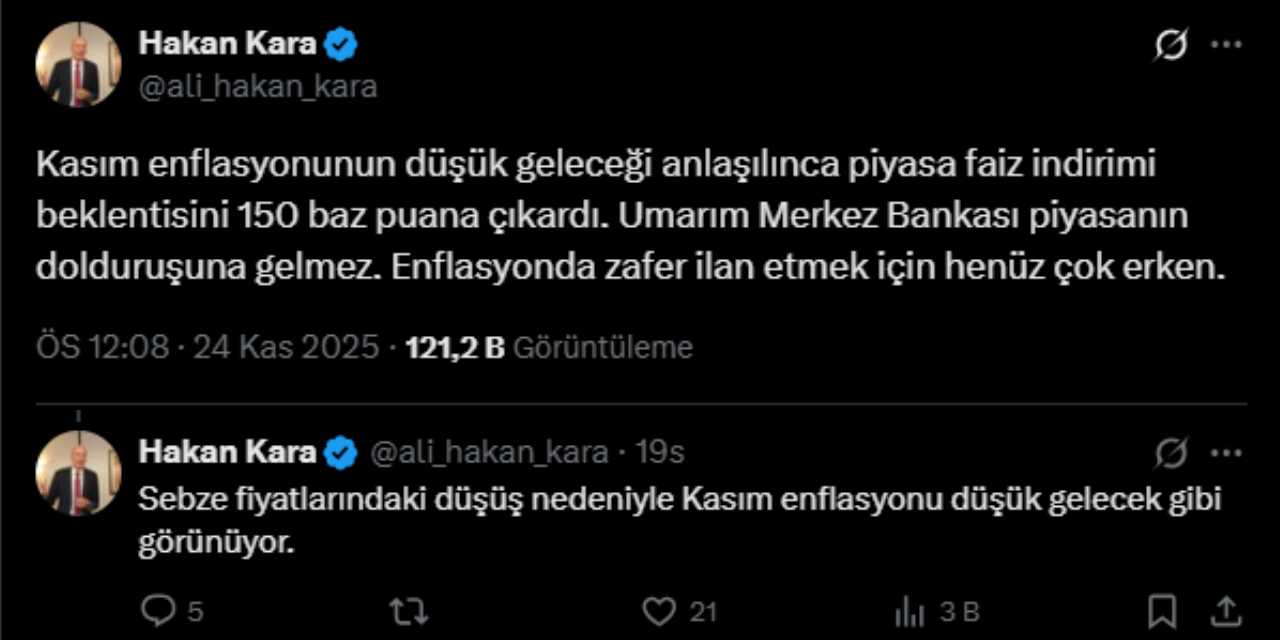 "Kasım enflasyonunun düşük geleceği anlaşılınca piyasa faiz indirimi beklentisini 150 baz puana çıkardı. Umarım Merkez Bankası piyasanın dolduruşuna gelmez. Enflasyonda zafer ilan etmek için henüz çok erken."