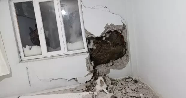Evin arka duvarında büyük hasar oluşurken, kaya parçalarından biri yatak odasının duvarını deldi.