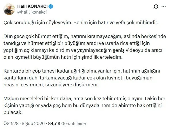 Paylaşmayı planladığı kapsamlı videoyu da aracı olan "kıymetli büyüğünün" hatırı için şimdilik ertelediğini belirten Konakcı, meseleyi son kez tehir ettiğini dile getirdi.
