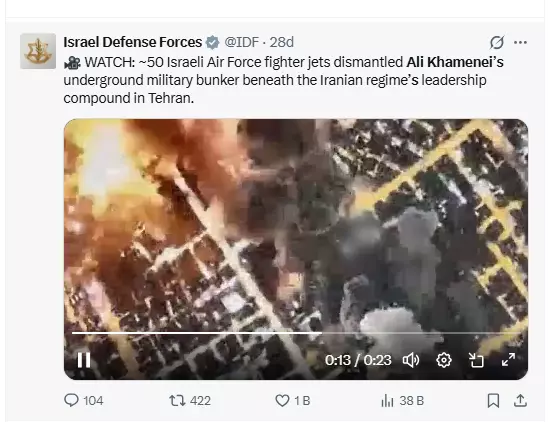 Yapılan açıklamada, saldırının İsrail Hava Kuvvetleri tarafından gerçekleştirildiği belirtildi. Açıklamaya göre İsrail'e ait 50 savaş uçağı, Tahran'da İran yönetiminin liderlik yerleşkesinin altında bulunduğu belirtilen Ali Hamaney'e ait yer altı askeri sığınağını hedef alarak imha etti.