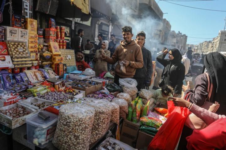 Gazze Şeridi’nin güneyindeki Han Yunus kentinde Filistinliler, Ramazan Bayramı hazırlıkları kapsamında tatlı ve kıyafet alışverişi için çarşılarda yoğunluk oluşturdu.